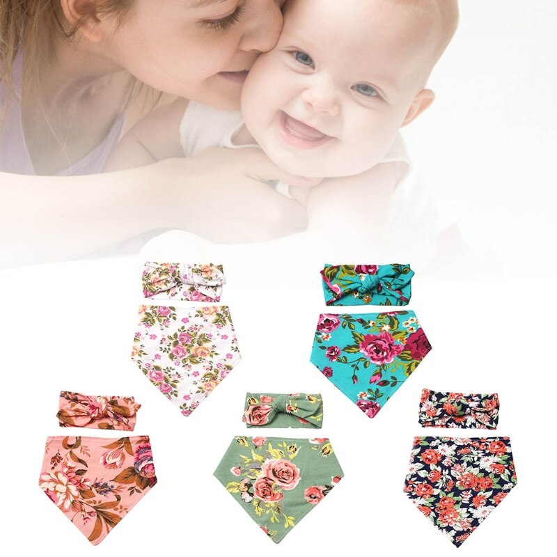 2 Pcs Babyvoeding Kwijl Bib Hoofdband Set Double Side Bloemenprint Bib Haarband 87HD